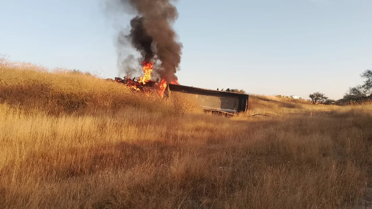 Un grave accidente se registró esta mañana en la Autopista San Juan – Encarnación de Díaz, a la altura del kilómetro 11, cuando un tractocamión volcó y terminó incendiándose completamente a un costado de la vía. La tragedia no solo involucró al pesado vehículo, sino que otro automóvil también impactó la unidad siniestrada.