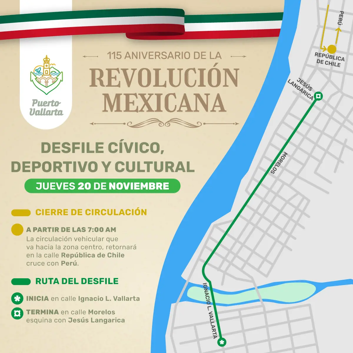 Con motivo de la celebración del 115 aniversario de la Revolución Mexicana, el Ayuntamiento de Puerto Vallarta informó sobre los cierres y la ruta oficial del Desfile Cívico, Deportivo y Cultural que se llevará a cabo el jueves 20 de noviembre, con motivo del 115 aniversario de la Revolución Mexicana. Este año será más corto el recorrido, debido a los trabajos de ampliación del Malecón al Parque Hidalgo, terminará ahí precisamente.