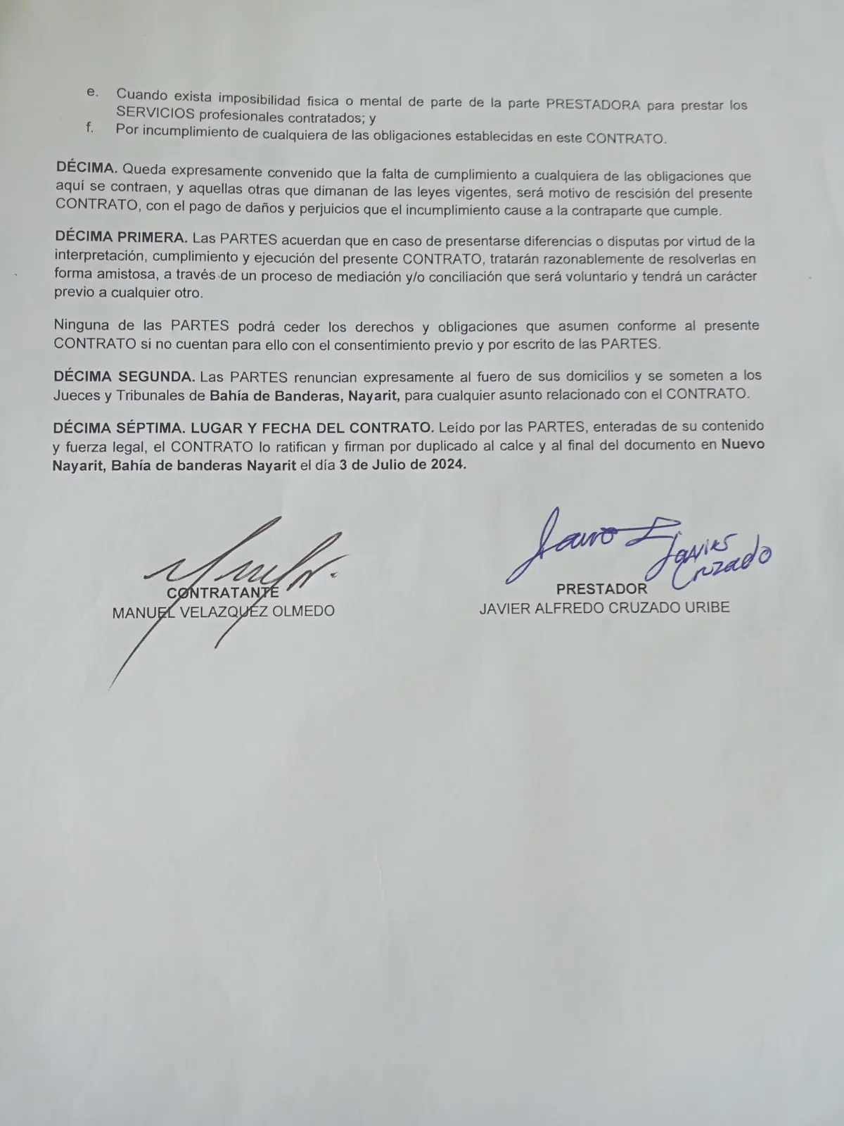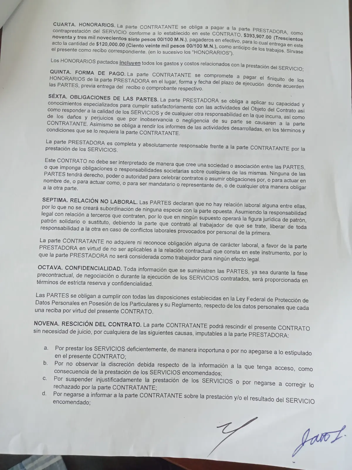 “DÉCIMA. Queda expresamente convenido que la falta de cumplimiento a cualquiera de las obligaciones que aquí se contraen, y aquellas otras que dimanan de las leyes vigentes, será motivo de rescisión del presente CONTRATO, con el pago de daños y perjuicios que el incumplimiento cause a la contraparte que cumple”.