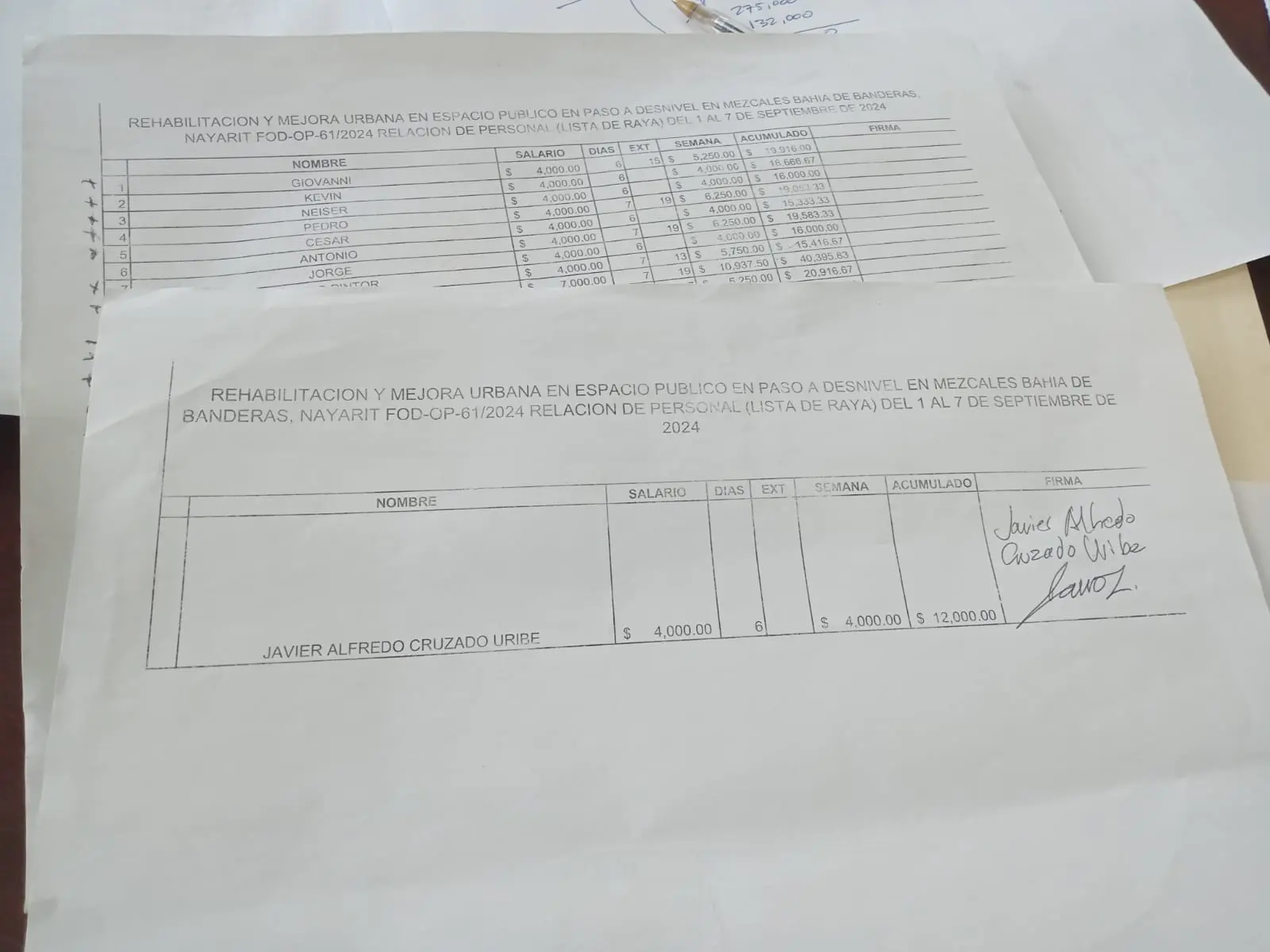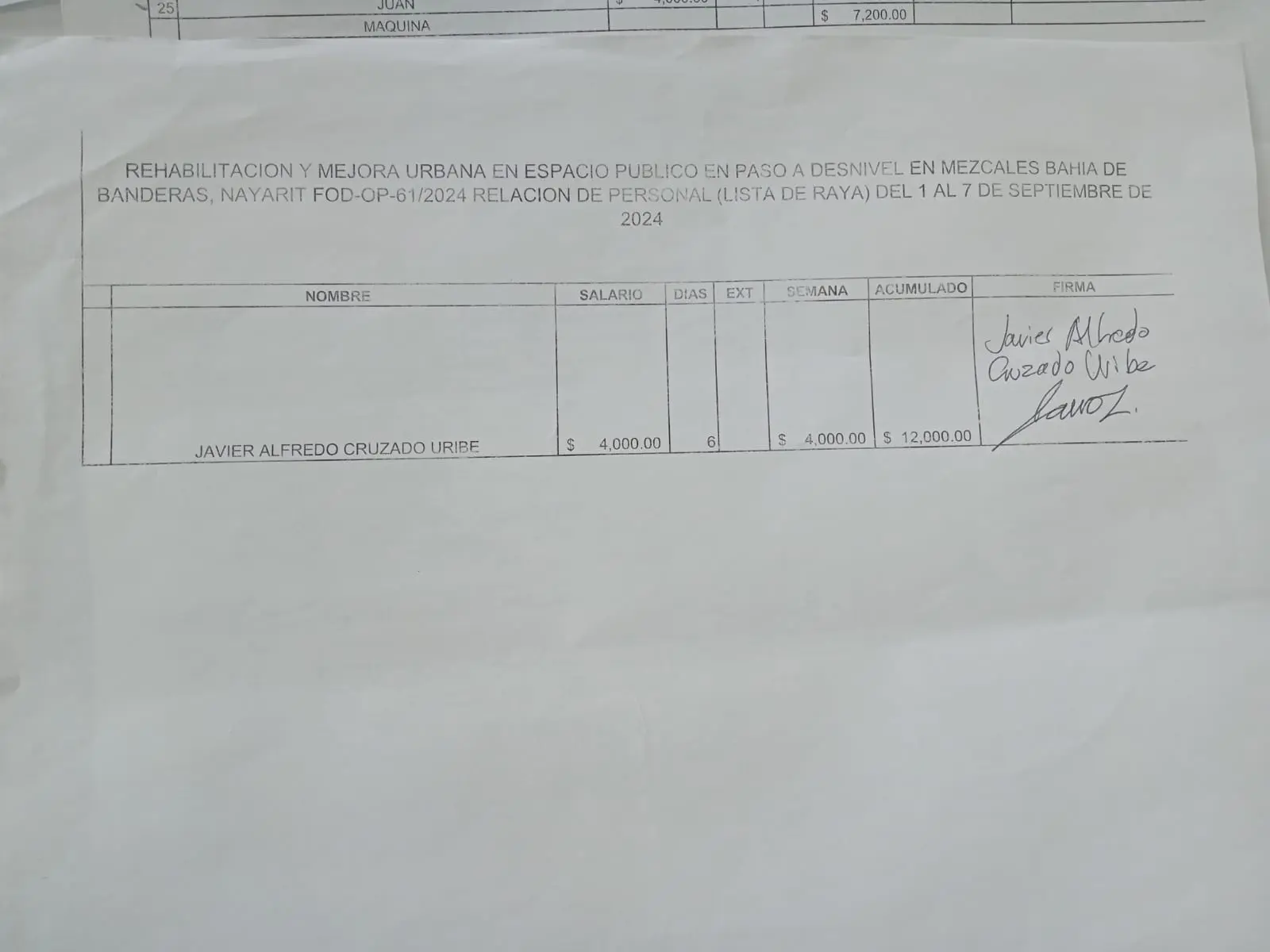 Desde entonces, Cruzado Uribe, al quedarse sin dinero, se convirtió en un empleado más. Según el contratista, “le quedó grande el proyecto”, por lo que fue apoyado con gasolina y fue incluido en la lista de pagos. Su participación fue mínima, limitándose a menos del 10% de la obra, con aportaciones en retoques y algunos murales menores.