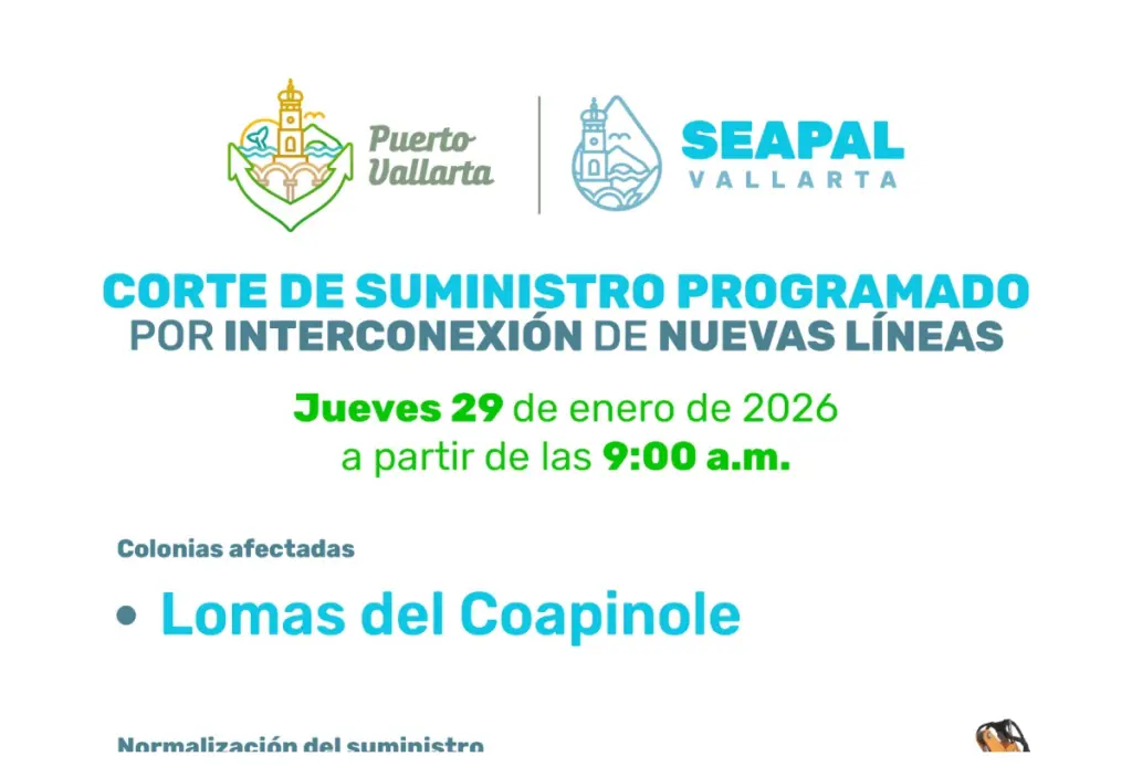 El organismo operador del agua en Puerto Vallarta informó que este jueves 29 de enero de 2026 se realizará un corte programado en el suministro de agua potable en la colonia Lomas del Coapinole, como parte de trabajos de ampliación y mejora de la red hidráulica.