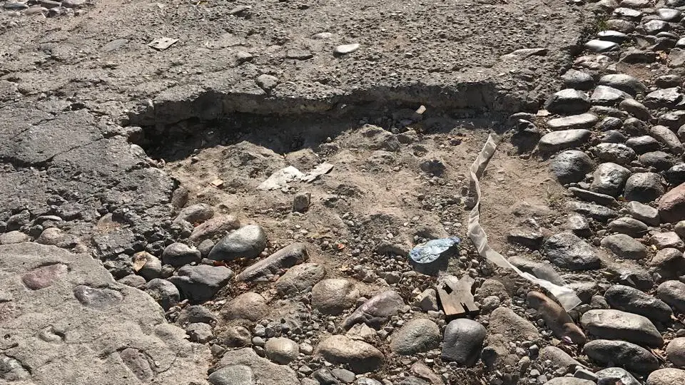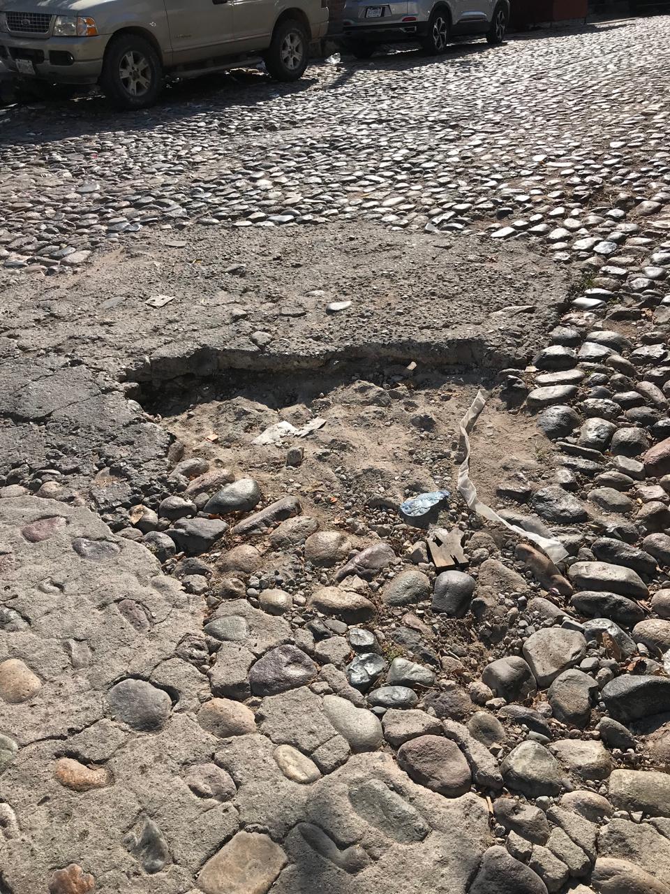 El presidente de la colonia, Jorge Godínez Bobadilla, compartió fotos y videos donde se observa la gravedad de los hoyos sobre el empedrado, afectando a los automovilistas que circulan por la zona.