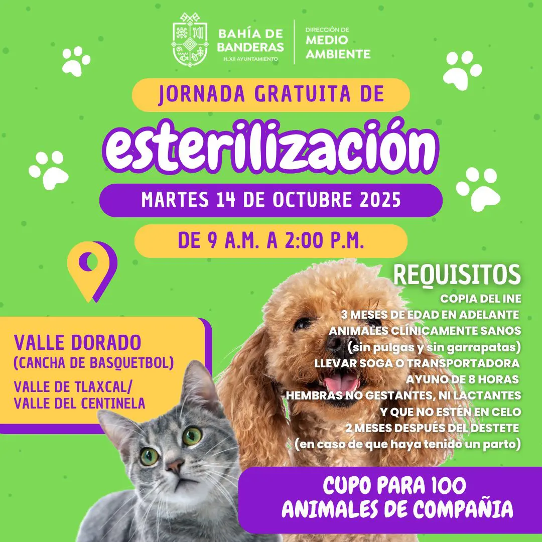 El próximo martes, la cancha de basquetbol de Valle Dorado, ubicada entre Valle de Tlaxcal y Valle del Centinela, será el punto de encuentro para una jornada gratuita de esterilización de perros y gatos, organizada por la Dirección de Medio Ambiente Municipal.