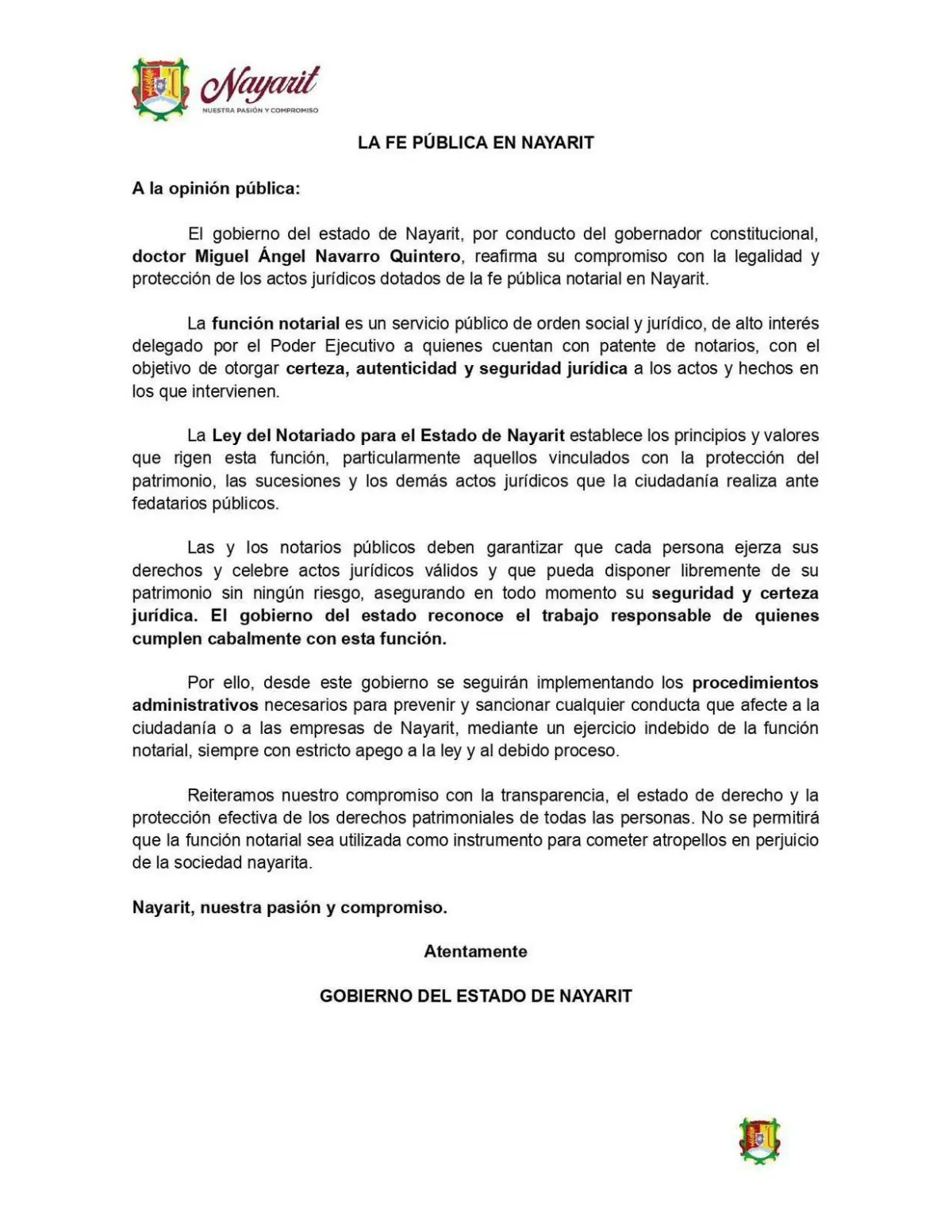 “Por ello, desde este gobierno se seguirán implementando los procedimientos administrativos necesarios para prevenir y sancionar cualquier conducta que afecte a la ciudadanía o a las empresas de Nayarit, mediante un ejercicio indebido de la función notarial, siempre con estricto apego a la ley y al debido proceso.”