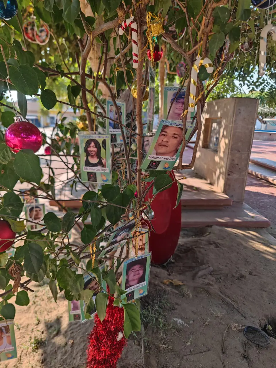 Madres buscadoras decoran árboles navideños en Valle de Banderas con los rostros de personas desaparecidas