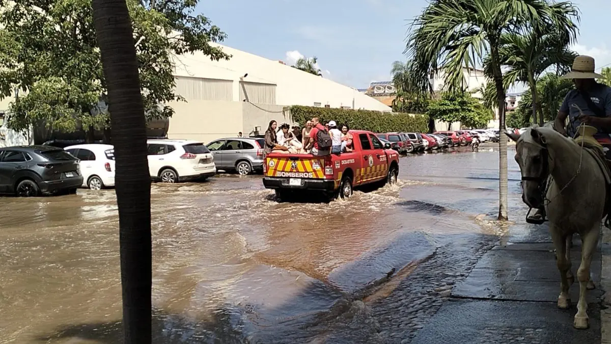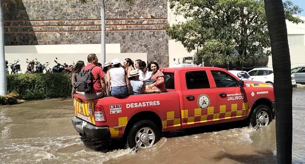 Un grupo de turistas y trabajadores fue rescatado la tarde de este miércoles 8 de octubre en la zona de Playa Flamingos, en Puerto Vallarta, luego de quedar atrapado por una intensa marejada provocada por los efectos del huracán Priscilla, que elevó el nivel del agua más de un metro sobre la calle principal.
